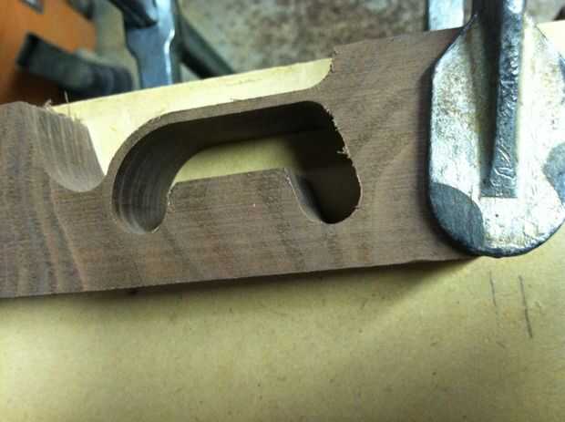 TRUSS ROD cubierta planificación y corte: era el momento de planificar la cubierta de barra de armadura que cubre el cabeza acceso común a la barra. Había mirado en comprar uno, pero no pudo encontrar nada, porque el radio en mi cabezal para arriba por la tuerca tenía un radio que no se puede emparejar con una cubierta comprada. Después de descubrir que el radio corresponde exactamente con la curva de un dólar de plata, decidí elaborar un perfil de lado de forma de la cubierta con el fin de llegar a algo aceptable. Creado algunas trayectorias, sujeta una pieza de 1" espesor nogal (a partir de las sobras del cuerpo) a la mesa de fresadora y cortar la forma del perfil.