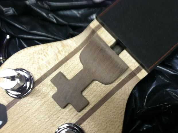 La Cruz cubierta: Que quería hacer esta cubierta de armadura única y ya la guitarra baja será usado predominantemente en un culto contemporáneo, decidí hacerla en la forma de una cruz. Hice un dibujo y trayectorias de la Cruz, grabó la pieza de nogal para la mesa de fresadora y cortar la parte transversal de la forma de la cubierta de la barra del braguero. Hice algunos pequeños mezcla y lijado y puesto en el cabezal de la guitarra para ver el ajuste. Será colocar unos tornillos de sujeción en lugares estratégicos, más adelante.