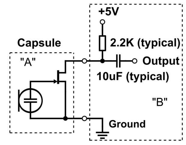 Se trata de cápsulas electret similares a las que usé en mi anterior instructivo con una gran diferencia. Tienen un transistor FET interno que la interfaz con el mundo exterior. El FET tiene una función adicional de un diodo interno que tiene suficiente corriente que puede sustituir la resistencia de ohm 1gig que se utiliza en el circuito de "Alice" o Schoeps en el instructivo de la salida. Ver que figura 1 caja "A" contiene la cápsula y el FET todo en un paquete pequeño agradable. Caja "B" contiene el resto de la electrónica necesaria para tirar de la señal del micrófono y enviarlo a lo que es el siguiente. La parte fresca de la es mayoría de los dispositivos que puede utilizar una cápsula de micrófono como esta ya contiene el condensador, la resistencia y la fuente de 5 volts DC. La mayoría de los FET se puede suministrar de 1.5 a alrededor de 10 voltios DC y funcionará. Alimentación como esta se llama energía de micrófono "Enchufe en el poder" o PIP. Cosas que esto incluyen tarjetas de sonido de PC, ordenadores portátiles Mac, teléfonos inteligentes, dedicadas grabadoras y cámaras réflex digitales con conectores de micrófono. Todo lo que tenemos que hacer es alambre de la cápsula a un jack de 3,5 MM correctamente y tenemos un micrófono externo rápido y fácil.