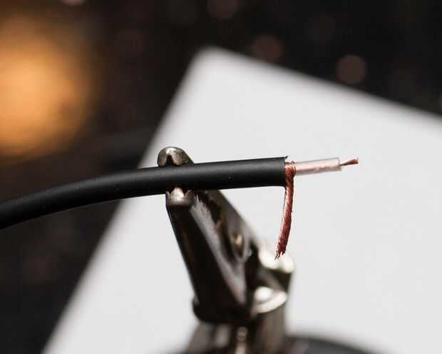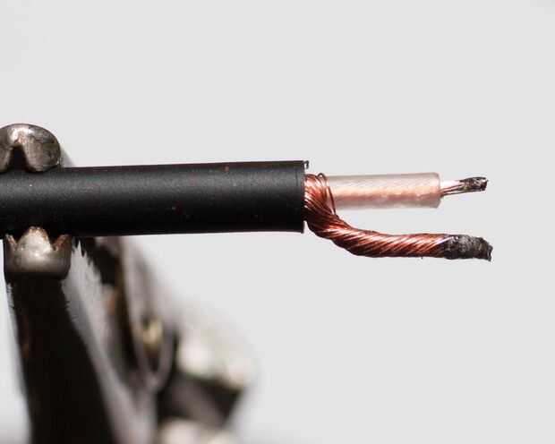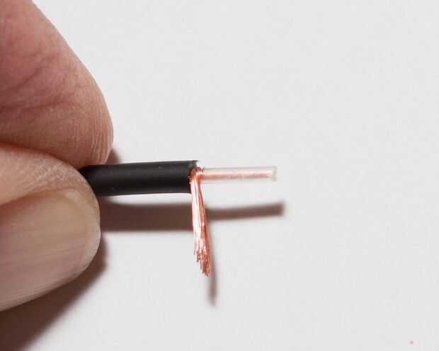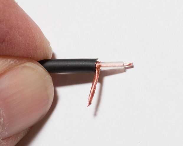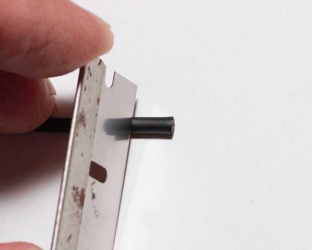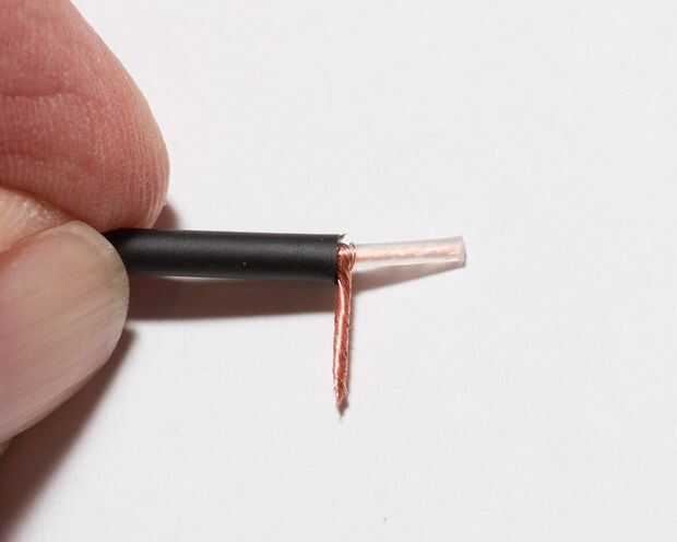 Primer paso para el cable de la tira. Necesitamos exponer la pantalla exterior para conectar a tierra y entonces el conductor interno. Estoy usando cable de espiral blindado. Esto es muy fácil trabajar con. Me gusta utilizar una cuchilla de afeitar para quitar este tipo de alambre ya que no estira el aislamiento y hace un bonito borde limpio. Tienes que tener cuidado de no cortar el alambre interior y solamente el aislamiento. Ver las fotos de paso a paso: