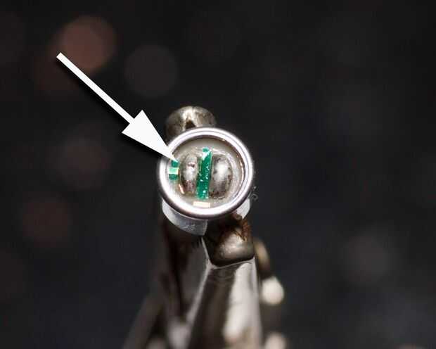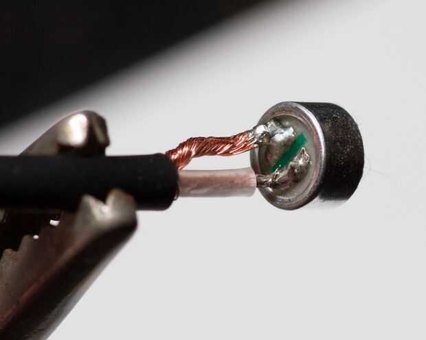Mire cuidadosamente la cápsula y se verá que uno de los pads de soldadura tiene un conductor pequeño que va al borde de la cápsula, que hace contacto eléctrico con la cáscara. Este es el terminal de tierra. Ver la foto con la flecha apuntando a la tierra. La otra conexión es el FET terminal que llamaremos "Mic". Forman los conductores para que estén cerca entre sí y coinciden con las lengüetas de la soldadura de la cápsula. Si es necesario, recortar el alambre del protector para que sea paralelo al conductor de centro. La soldadura con cuidado los cables a la cápsula para que la cápsula quede alineada directamente con el cable.