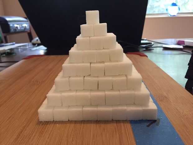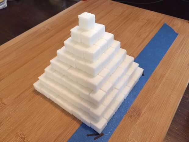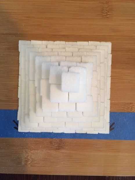 Como se puede ver, hemos conseguido nuestros lados rectos reduciendo cada curso por la misma cantidad (1 cuadra). La pirámide es agradable y estable porque las costuras son tejidas juntos/escalonados. Como discutido previamente, nuestra pirámide es un poco alto es bajo, pero es definitivamente en forma de pirámide. Nos podríamos haber dejó la parte superior 2-3 capas y habríamos tenido una pirámide muy similar a los que se encuentran en América Central y del sur del Imperio Azteca.