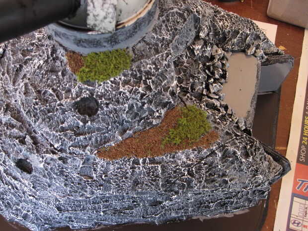Si han quedado alguna manchas planas, como la cima de una colina la base o una parte menos inclinada, colocar hierba estática y alguna suciedad modelo a estas áreas.