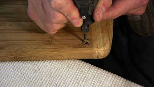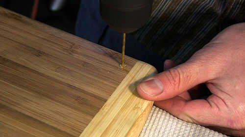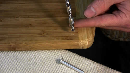 b. Perfore dos 1/8 orificios piloto perfectamente verticales y perpendiculares a la tabla de cortar. (Utilizar un taladro o taladro a guía para todos estos procedimientos si tienes uno).