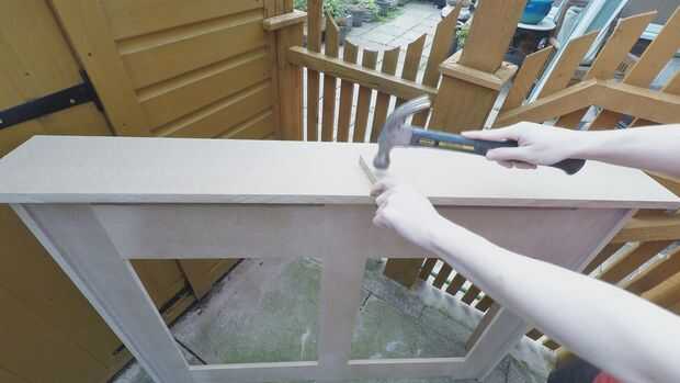 Luego aprovechado a lo largo de la plataforma con un martillo para dejar una marca donde taladrar los orificios correspondientes de los tacos en el estante.