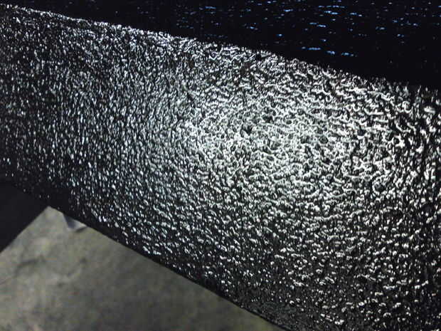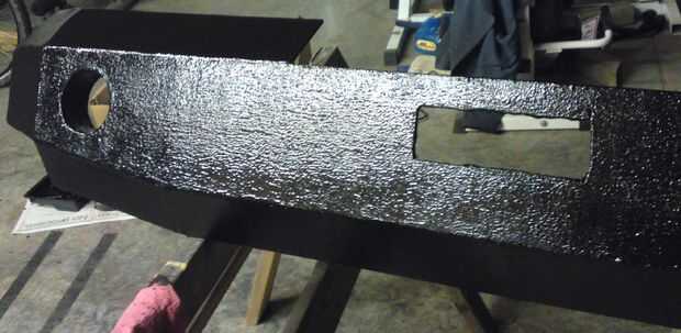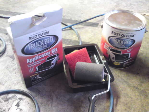 Después de tenerla limpia, en una zona bien ventilada, aplique el bedliner de Rust-Oleum utilizando el rodillo. El material parece más texturado cuando mojado... pero se seca a una buena textura, pero no demasiado acabado texturado'.