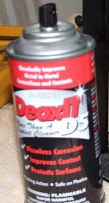 Utilicé DeoxIT D5 contacto limpiador, pero estoy seguro de que otros limpiadores contacto también funcionaría. Además el contacto limpiador, me froté suavemente con la parte plana de un destornillador de ranura que fue cubierto con contacto limpiador. La parte que necesita ser limpiado consiste en el contacto frontal y la parte de la primavera que toca.
