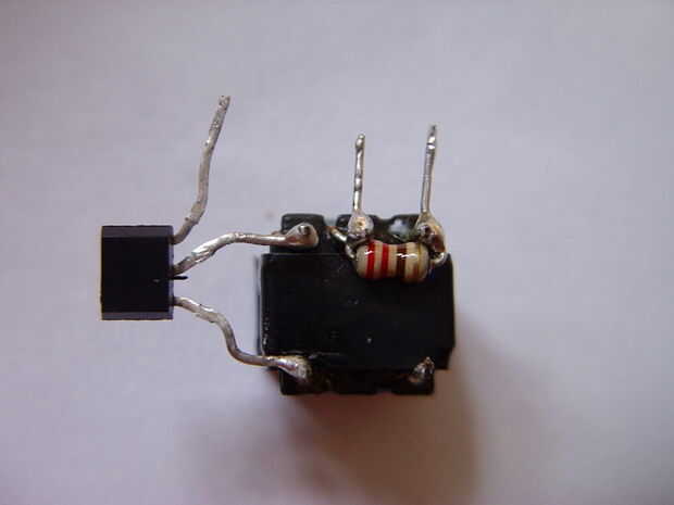 Un cable de la resistencia de 220 ohm al pin 2 del transformador de la soldadura y la resistencia de la soldadura del otro cable al pin 3 del transformador.
