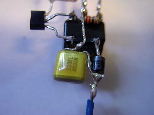 Y soldar el cable de salida de alto voltaje (azul) al cátodo del diodo y el condensador.