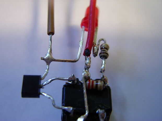 Soldar el cable de tierra (negro) de la batería en el emisor del transistor y el cátodo del LED.
