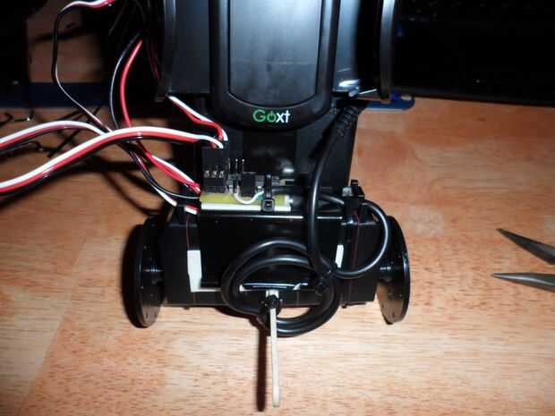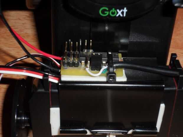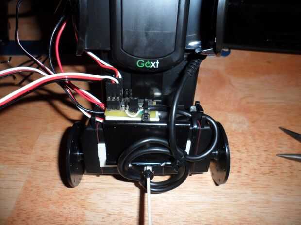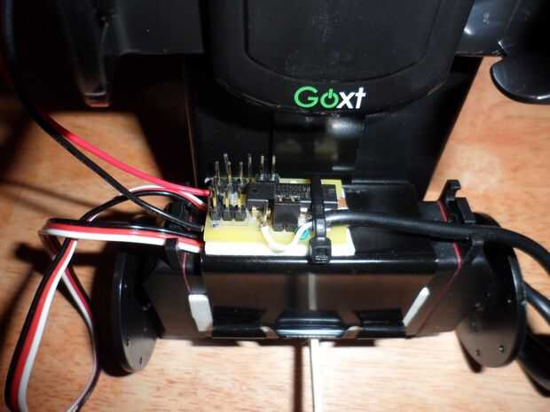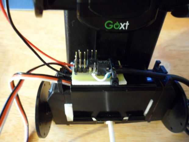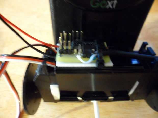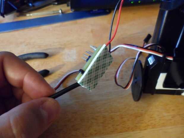 Paso 16) Enchufe conectores de 3 pines de los dos servos RC en el A2SCB_ML con el cable negro hacia el borde de la tabla como se muestra.