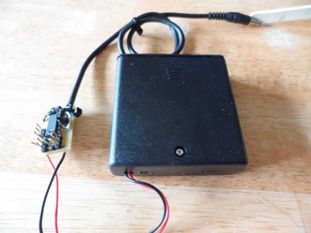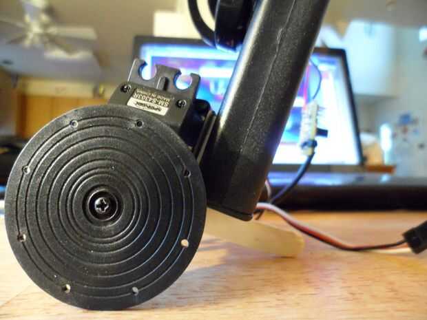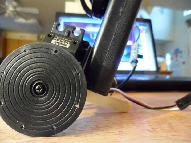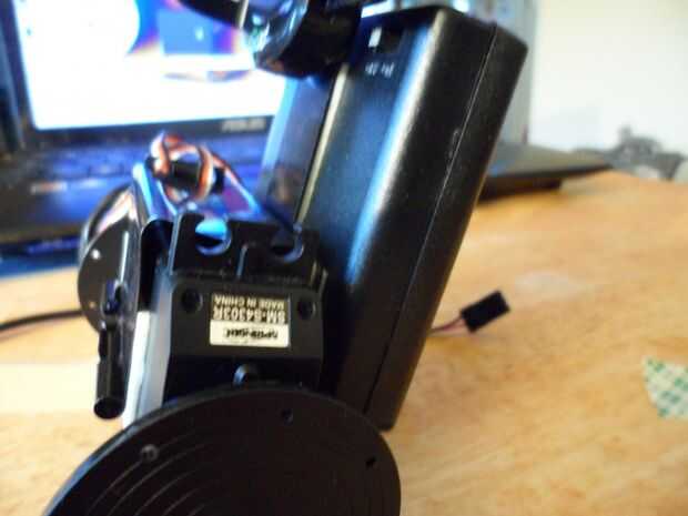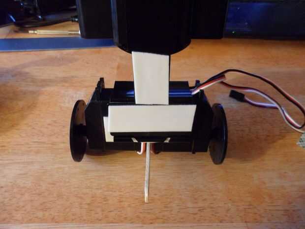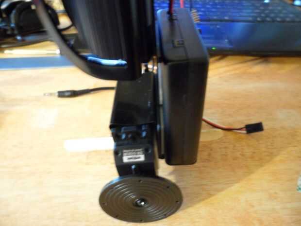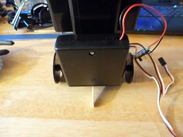 Este proyecto utiliza la Junta de EMGRobotics A2SCB_ML ( www.EMGRobotics.com ) que se suministra con un soporte de la batería 4AA. El lado del interruptor del soporte de la batería 4AA se pega a la parte posterior de la montura T como se muestra usando cinta de doble cara. El interruptor enfrenta a la parte delantera del robot como se muestra. El lado del tornillo de soporte de las pilas 4AA será visible desde la parte trasera del robot, lo que es fácil cambiar las pilas.