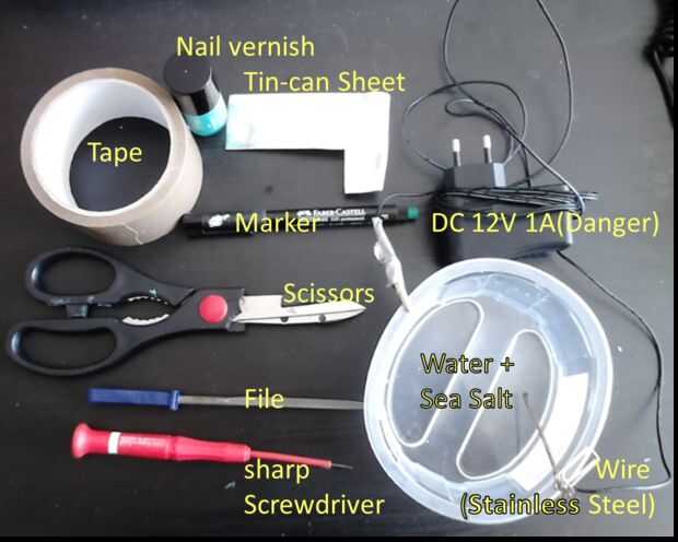 -sal, un vaso de plástico (profundidad suficiente para sumergir la hoja de metal todo en él) y agua (concentración sales vs peso 1 a 10)