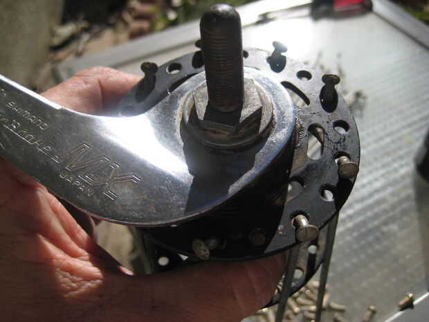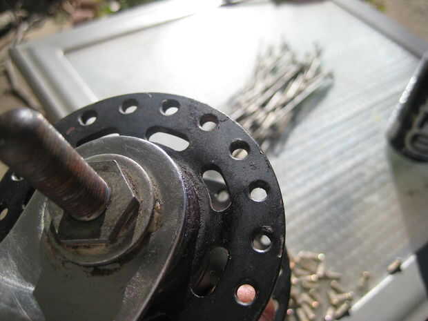 Sujetando el eje con una pestaña paralela al suelo, tomar 9 radios y colocar uno en a todos los otros agujeros de la brida. Asegúrese de cargar radios desde el borde exterior de la brida para este primer paso. Será evidente más adelante por la dirección es importante.