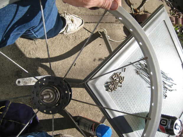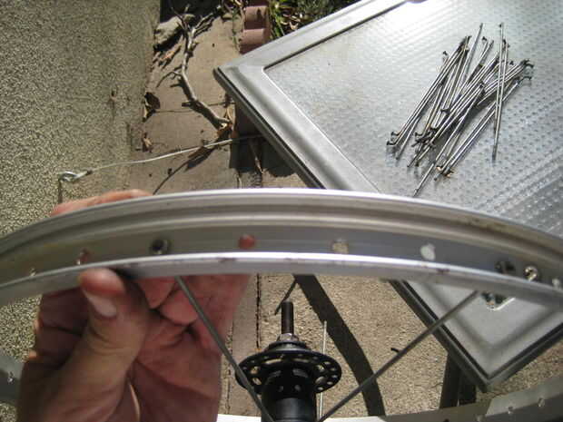 Continúe alrededor de la rueda, saltar tres agujeros e instalar la siguiente habló en el cuarto hasta que los nueve rayos.