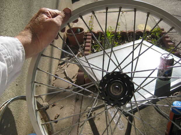 Todo lo que sigue a esta Asamblea es cargar los últimos nueve radios desde el interior del cubo. Tomar alguno de estos radios y Cruz en tres de los radios que se han cargado desde el exterior del eje y será muy cerca de un agujero. Instale un niple en ese agujero y continuar alrededor del borde como lo hicimos en los tres cursos anteriores.