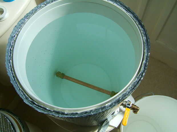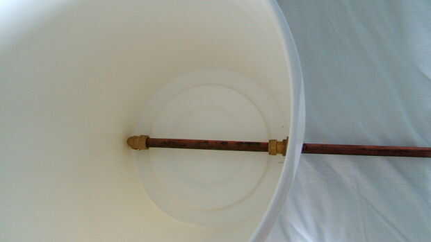 Luego empezar a alimentar el tubo de cobre aunque se. la idea es hacerlo llegar a todo el diámetro del cubo y toque como baja abajo en el lado lejano como sea posible para que cuando nos drenaje podemos conseguir un efecto de sifón que va a drenar tanto de la cerveza la deliciosa y dulce posible. Podido hacia abajo pero esto ayudará un poco para la parte inferior de la cubeta interior.