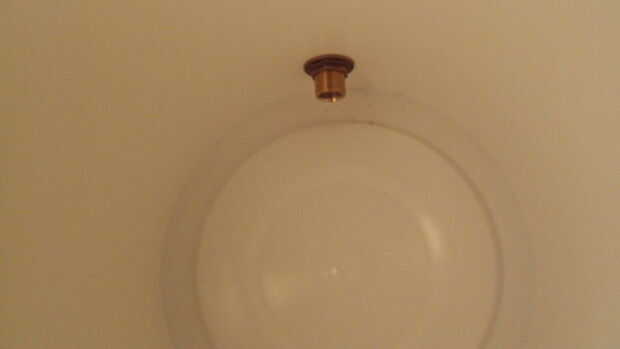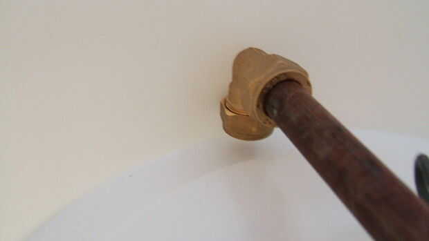 Pop un codo de compresión en el extremo allí para que apunte hacia la parte inferior de la cubeta (Foto 3). Haga una marca en el tubo de una pulgada de la cubeta con un rotulador o similar (pic 4?). Luego corte a lo largo de esta línea. Cortadores de tubería son baratos, fácil de usar y dar un buen corte recto a diferencia de una sierra para metales.