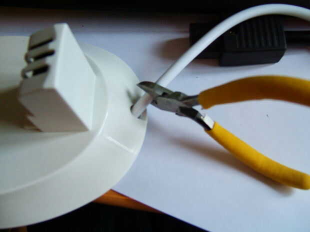 4 - cortar los cables por lo que son la longitud correcta. Tira de un cm o así del aislamiento, tuerza el alambre y envolver alrededor de los tornillos flojos. Apriete los tornillos. Asegúrese de que obtener vivo, neutro y tierra los cables en el lugar correcto. Deslice el collar negro en su lugar y ajustar la cosa con la abrazadera del cable rojo pequeño que quitó.