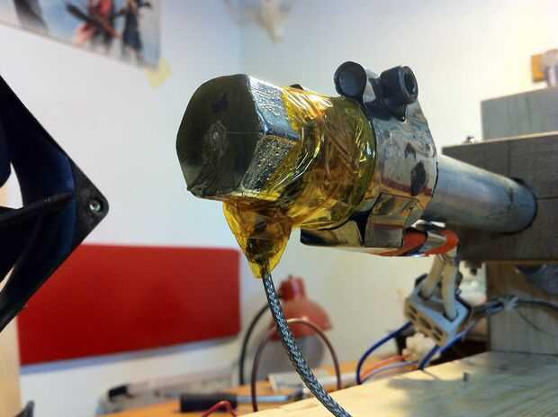 A continuación, toma un pedazo largo de 10cm de tubo de aluminio con un diámetro de alrededor de 1cm y colocar delante de la boquilla utilizando un alambre rígido. Esto da el filamento un rizo bonito al refrescarse.