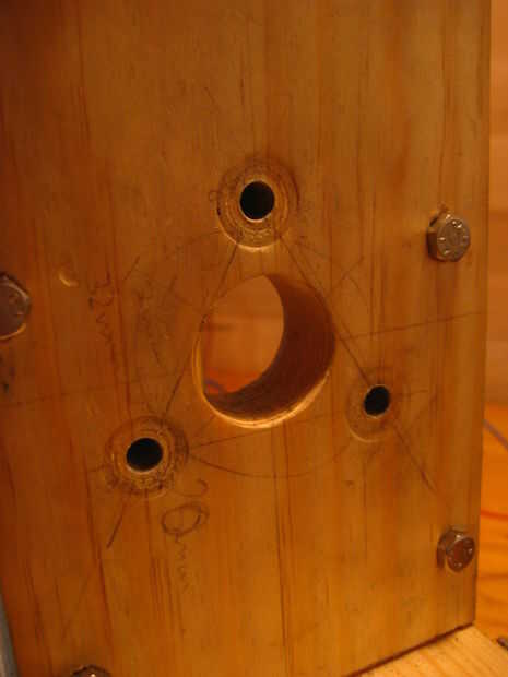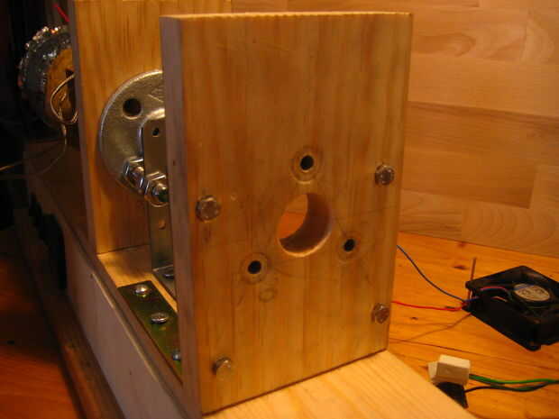 El motor tiene un eje de rosca. Para el acoplamiento a montar en el motor, tomé una tuerca hexagonal con 13mm de diámetro externo y poner en el eje. Cuando gira el eje y el acoplamiento está conectado, la tuerca se desenrosque. Para solucionar esto perforó un agujero entre la tuerca del adjuntada y el eje del motor y en un perno de acero de 2mm. Esto evita que la tuerca de apertura. Ver la última imagen de arriba.
