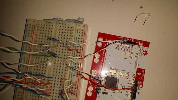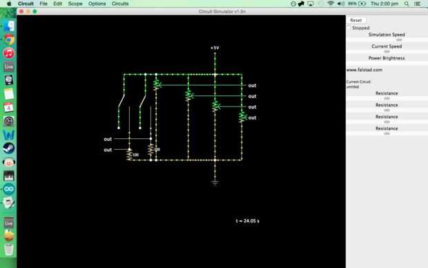 La resistencia en esto y la siguiente, circuitos es muy importante. No resistencia provoca un circuito abierto, que le enviará una tensión sin restricciones el MaKeyMaKey, dando por resultado ruido capaces de congelar o estrellarse computadoras si funcionaron en un monitor de la serie para una duración larga. En los circuitos del potenciómetro, el potenciómetro se servía de este resistor, emparejar el voltaje después de la mitad de la terminal a tierra.