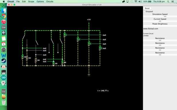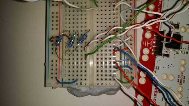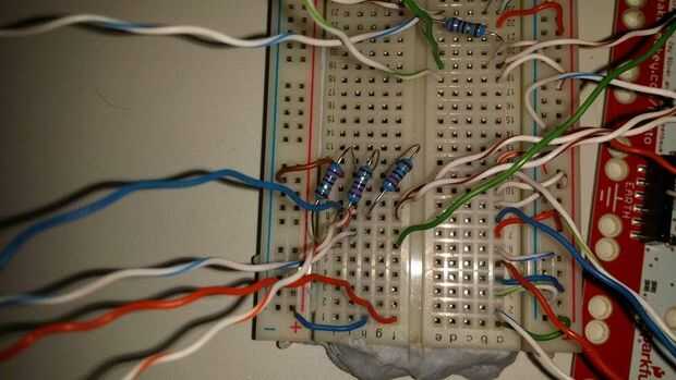 - Coloque tres resistencias que van de tres filas diferentes a la tierra. Este permitirá tres entradas diferentes. Si quieres tener más muestras para trabajar con, usar más de estos puntos. (Nota: el número de muestras es limitado en esta configuración por el número de puertos digitales disponibles).