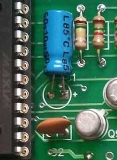 C1 = condensador electrolítico de 10μF y es polarizado. Tenga en cuenta la franja que indica el lado negativo. La serigrafía muestra un signo "+" para positivo. La soldadura del condensador con suficiente espacio que puede doblar el condensador sobre poner al ras con el tablero.
