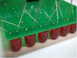 Instale una fila de LEDs a la vez. Una pierna de cada LED en un momento de la soldadura para poder hacer ajustes menores a su cargo. Tómate tu tiempo. Las filas de la rectas, mejor se verá la pantalla. El lado plano del LED en la serigrafía indica el lado negativo. La pierna más corta de un LED es negativa.