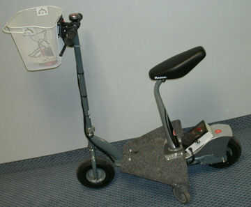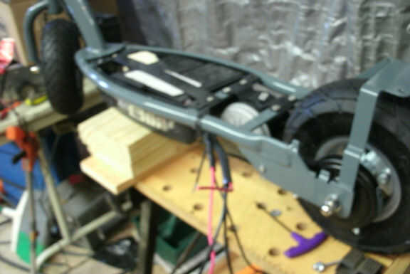 Nota la caja electrónica detrás de la tija de sillín. Contiene un controlador programable que permite que la motocicleta se mueva muy lentamente o hasta 12 mph y donde en el medio. Se selecciona el tipo de controlador, omnidireccional barato o caro bidireccional. Los relés están montados dentro de la planta en la zona donde se quita el controlador suministrado por la maquinilla de afeitar.