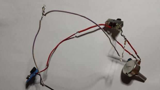 en el lugar donde se conecta el potenciómetro con el interruptor, la soldadura la 10 k risistor a ella los leds puede enciende cuando el interruptor está encendido, y soldar el otro extremo del cable de LED a tierra.