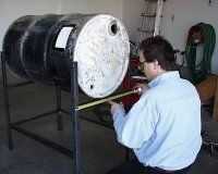 Con el marco completo, permite pasar al barril. Una vez más, asegúrese de que el barril líquido que has seleccionado no ha contenido materiales inflamables o químicos. La tapa de la barbacoa debería ser sección de una cuarta parte del cañón. Por lo tanto, pone el barril horizontalmente en el marco. Buscar el centro del cañón con su cinta métrica y marcar de dos líneas de tiza, que se intersecan en el centro del círculo. Debe parecerse a una cruz en cada extremo del cañón, o un pastel cortado en cuatro trozos incluso.