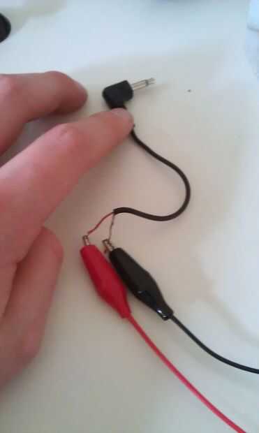Ahora que eso se hace, poner tus clips de cocodrilo o de alambre en los dos extremos del cobre respectivamente. En los otros extremos, poner a su desnudo trasero auriculares 3.5mm. Realmente no importa si es positivo o negativo, como el altavoz no está polarizado por lo que sé.