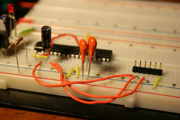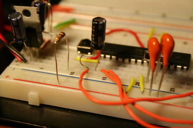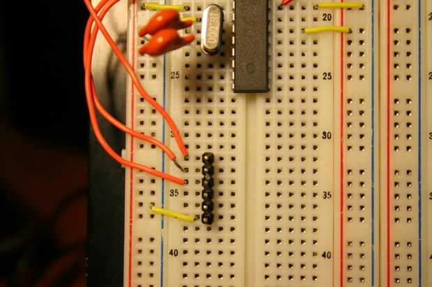Dos cosas principales que debe saber aquí. En primer lugar, no nos estamos conectando la clavija de alimentación. No estamos haciendo esto porque el tablero estará equipado con la batería en todo momento y no tenemos un sistema de seguridad para evitar que la corriente de corto circuito a la batería y el ordenador. Esto significa que siempre va a tener la batería conectada, incluso mientras que la programación tiene que estar conectado. Si desea utilizar la computadora para poder, simplemente retire la batería y conecte la energía (fila 3) a los carriles de la energía en su tabla. En segundo lugar, el perno DTR. Esta conexión de pin a través del condensador permite el programa reiniciar automáticamente el chip y programación. Si no tienes tu chip esta conexión será no programa y usted obtendrá un mensaje de error. También puede presionar el botón reset en la placa al programar, pero esta conexión es sólo más fácil.