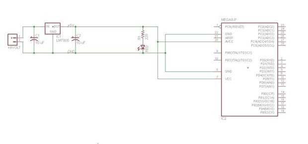 Ha establecido por el poder de la viruta. Atención: Estos son los números ATmega328, no corresponden directamente a los pines de Arduino. Consulte la ilustración para el etiquetado de los pines Atmega328. Hay dos lugares donde se necesita para conectar la alimentación y tierra, y Si configuras los rieles a ambos lados de tu protoboard esta voluntad es muy fácil. Usted tendrá que alimentar a los pines 7 y 20 y tierra a los pines 8 y 22.