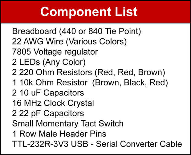 Antes de empezar, asegúrese de que tener todos los elementos necesarios en el cuadro de lista de componentes. Si necesita comprar piezas puedes hacerlo desde mi sitio en www.ArduinoFun.com o vea abajo para otras tiendas en línea* Véase la nota sobre el cable TTL-232R en programar las opciones antes de comprar.