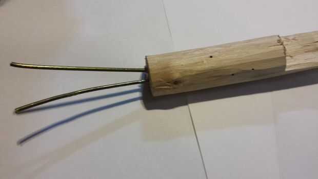 Ahora en este se fije las dos piezas de alambre a Atlatl. Empezar colocándolos verticalmente y luego aplicar una cantidad generosa de pegamento caliente a la zona.