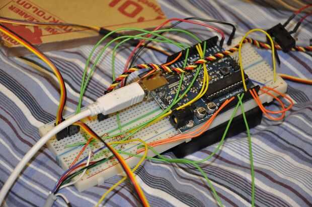 Como tengo pensado usar el Arduino para otros proyectos (tal vez de un robot oruga: D), el cableado se realiza con cables de puente y un tablero de pan barato. Usted puede comprar el proto-escudo de Arduino si quieres que el proyecto sea permanente. En cuyo caso también puede considerar un BareBones Arduino para ahorro de costos.