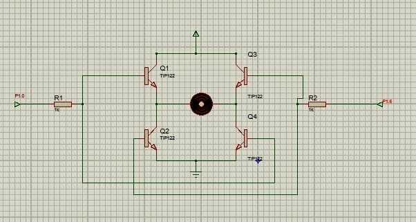 En este diagrama se puede ver que q1, q2, q3, q4 transistores. Cuando P1.0 es alta entonces el Transistor q1 y q2 en. el transistor q2 y q3 quedan en estado porque la P1.6 es baja. entonces la dirección del flujo corriente positiva del transistor q1 y el flujo a través del motor y consigue un motor otro extremo y flujo a través del transistor q4 luego a tierra. así que el motor gire en una dirección. Cuando P1.6 es alta y P1.0 baja entonces los transistores q2 y q3 en entonces el flujo de corriente a través del q2 y q3 para que la corriente opuesta a la anterior así que el motor gire dirección opuesta.