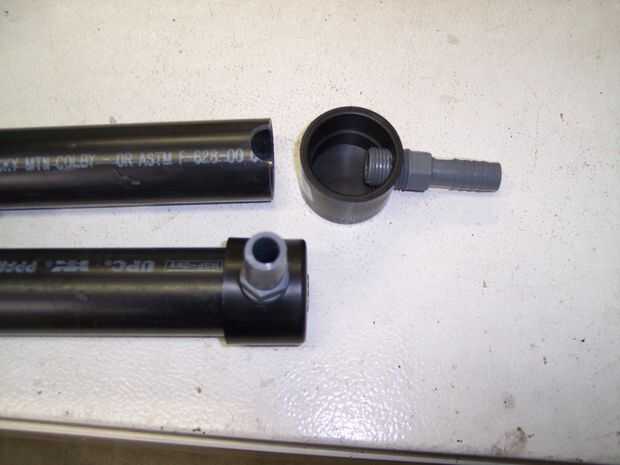 8. hacer un ajuste seco, montaje de los tubos del ABS, casquillos y pezones de la manguera. Puede que necesite tallar un poco fuera de la muesca para la conseguir la ranura en el tubo para alinear con la ranura en la tapa.