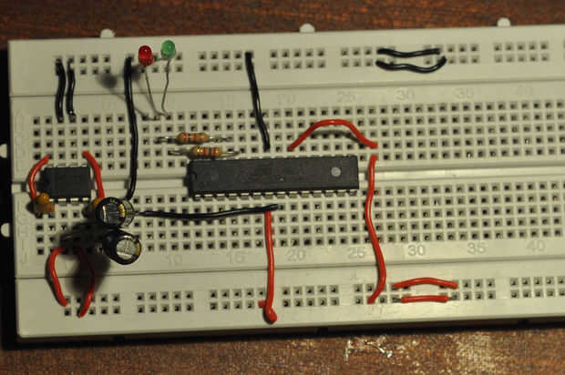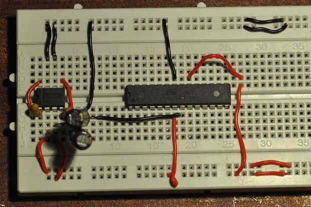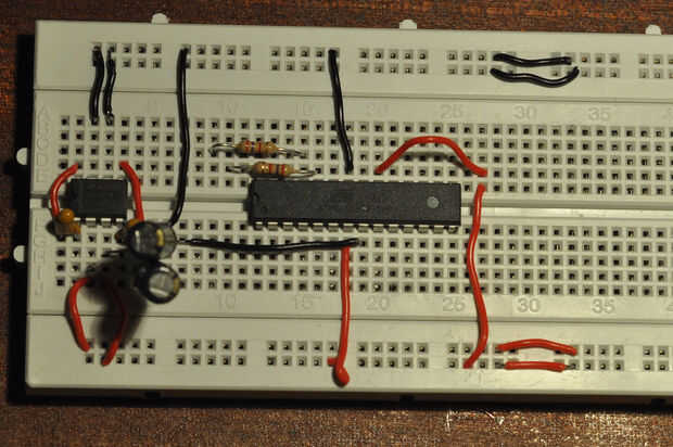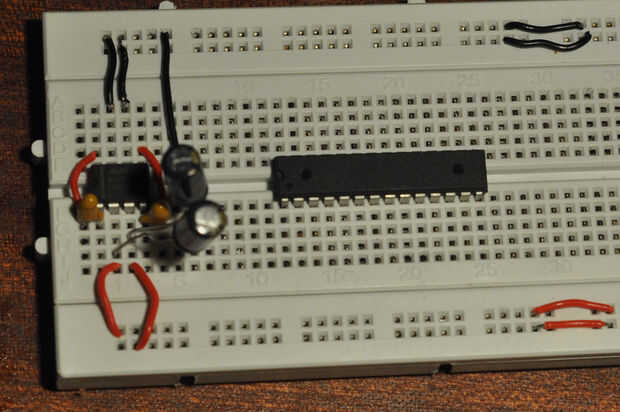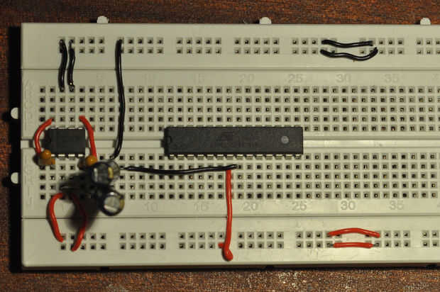 Trabajando hacia abajo, llegamos a los pines 7 y 8. Estos son VCC y tierra respectivamente. Conecte el pin 7 con un cable (rojo) en el riel de 5V y el pin 8 a tierra.