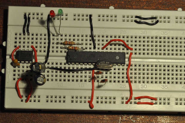 Para los LEDs que vamos a utilizar los pines 24 y 25. Poner un LED y un resistor en serie con cada pin (que va a tierra). Compruebe que la polaridad de LED es correcta (es poco probable que usted va realmente quemarlo con bajos voltajes si usted alambre hacia atrás, pero no se enciende). La pata negativa es en el mismo lado que el guión plano en la cubierta plástica.