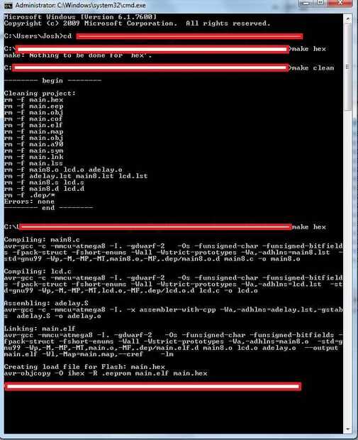 Para realmente compilar el código en binario .hex que tu micro se puede entender, solo utilizamos el símbolo del sistema. Desplácese hasta el directorio que necesita el comando "cd", reemplazando con el directorio del archivo. Luego simplemente escribe "make hexagonal" y pulse enter. Lo que debe provocar es unas pocas líneas de escritura que puede ignorar y debe aparecer un archivo .hex en el directorio con el código fuente. Si algo salió mal, el compilador se escupa un error generalmente con un número de línea y el archivo que el error fue en. Entonces usted puede ir a la referencia de la línea, solucionar el problema e inténtelo de nuevo. El código proporcionan aquí debe ser compilable o compila al menos en mi máquina. No decir libre de error porque no hay código nunca es!