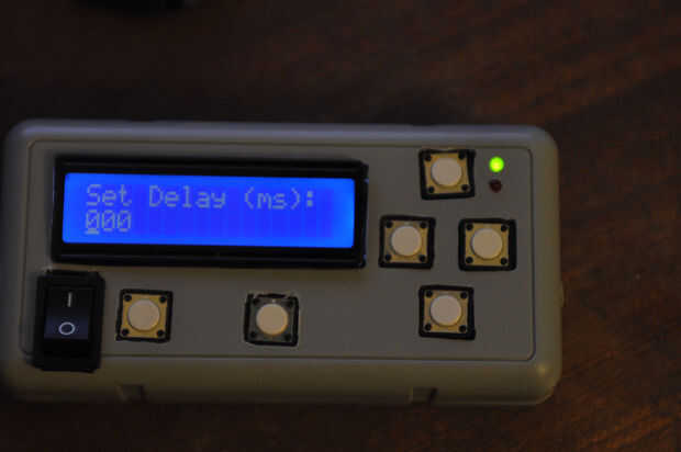 Cuando el objeto rompe el rayo láser, se activará el adc, el retraso esperará hasta que el objeto ha impactado a la superficie del agua y de la cámara * debe * tomar una foto de él.