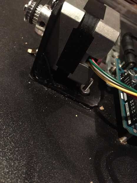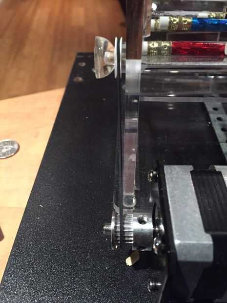 A continuación, nos se atornille el motor paso a paso sobre la base también. El eje del motor debe ser algo alineado con el extremo de la varilla de giro dentro del dispensador de acrílico. Esto es así podemos ejecutar un sistema de poleas para girar la varilla y expulsar un lápiz.