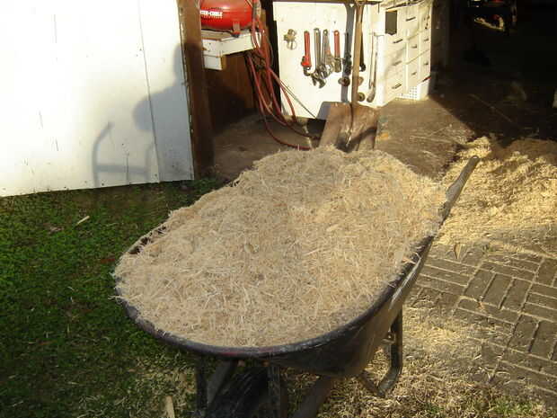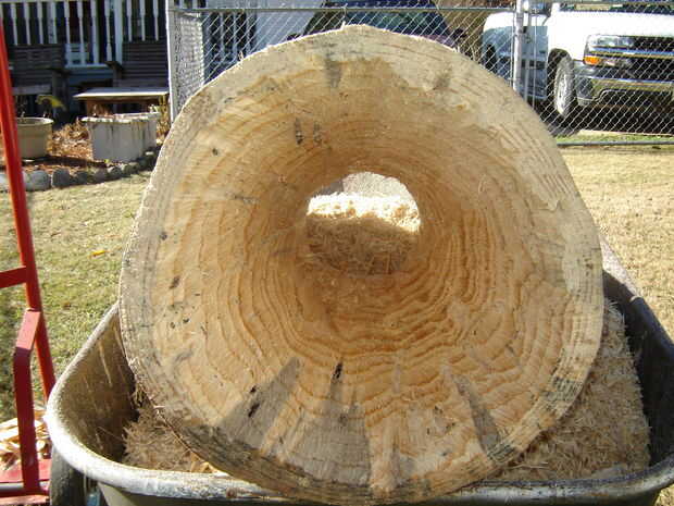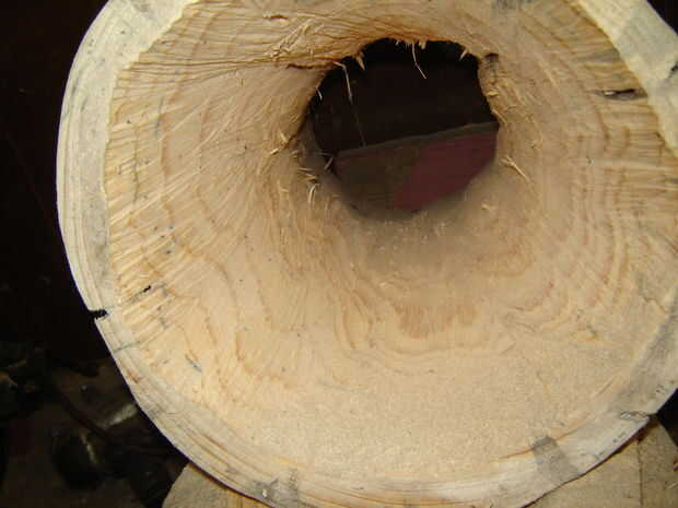 Mi método es usar una motosierra para romper para arriba el interior. Luego usé un martillo a un tubo de acero de 2 pulgadas de diámetro a través del tambor. El método de tubo de acero podrás sacar grandes cantidades de material a la vez. Supongo que esto va sin decir, pero este proceso va a crear montículos de aserrín como lo demuestran las fotos. Además, el interior puede dejarse un poco bruto. No debe ser liso, creo que leí en algún lugar rugosidad da un mejor tono.