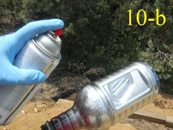 10-a. decidir qué tipo de pintura utilizas para agregar los toques finales a su quad copter. Ser un residente de Arizona a tiempo parcial, decidí usar el rojo, azul, amarillo (colores de la bandera AZ) y pintura de aerosol de plata. Comencé con pintura de plata para rociar los brazos de fuselaje, porque necesitaban ser pintado anteriormente en el proceso para fines de cableado. Antes de los brazos de la quad copter de pintura a pistola, grabado un pedazo de papel que había sido cortada para ocultar la base de la botella, porque no quiero que cualquier pintura de aerosol de la espuma que se encuentra dentro de la botella, o estorban a los anclajes de pared de plástico que se unen a la parte inferior.