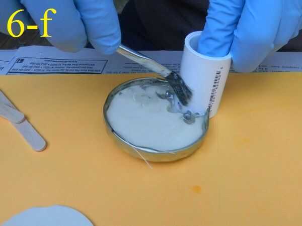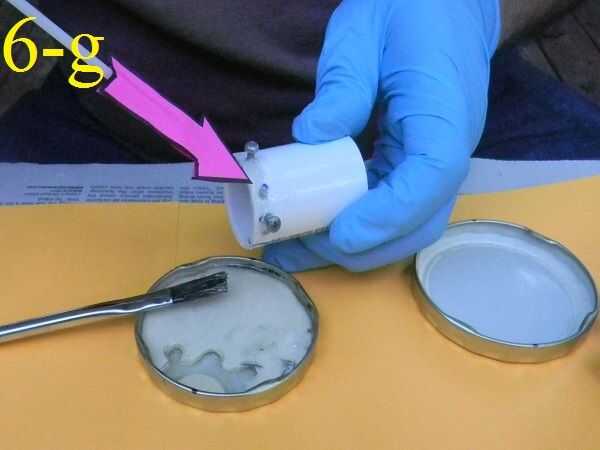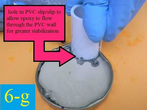 6-g. A continuación la mezcla y una capa de epoxy entre las ranuras en el conector para crear una fuerte conexión entre él y la base del cepillo. Mientras hace esto, asegúrese de que están propagando el epoxy generosamente en el agujero en el centro del conector de PVC slip/slip, para asegurarse de una robusta conexión para la base.