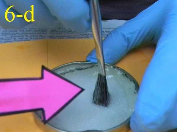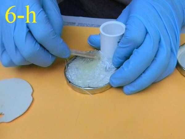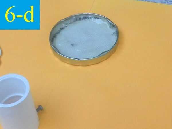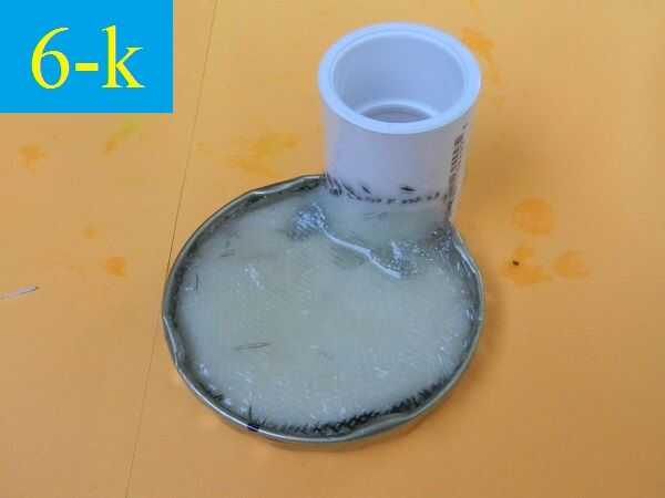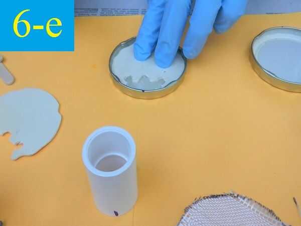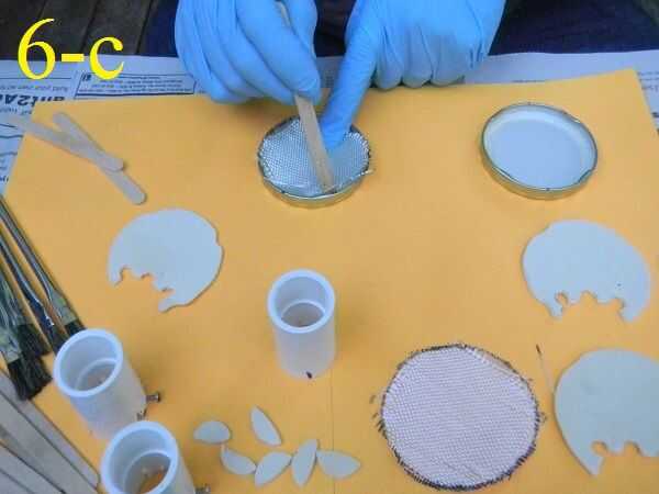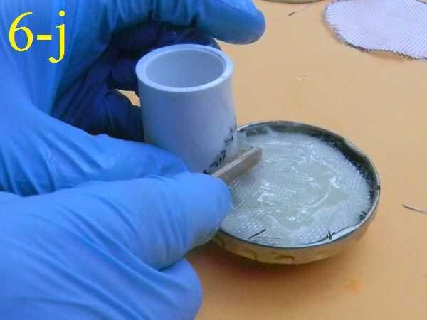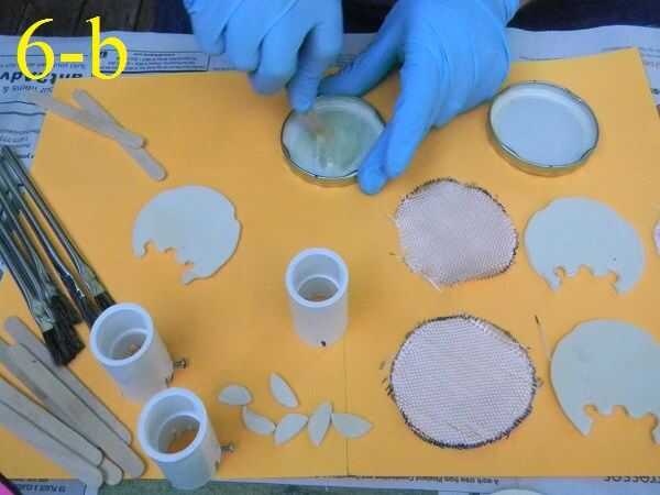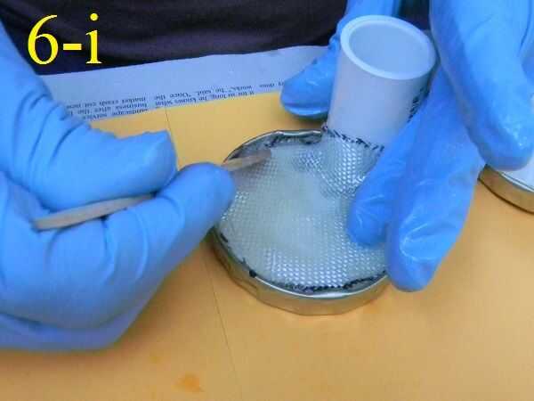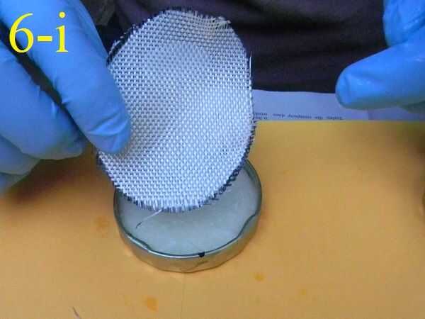 6-c. Luego coloque un círculo de tela de fibra de vidrio sobre la parte superior de la epoxy y empuje hacia abajo suavemente con un palito, en orden para el paño para adherirse a la base de metal.