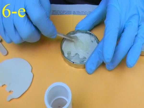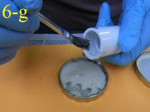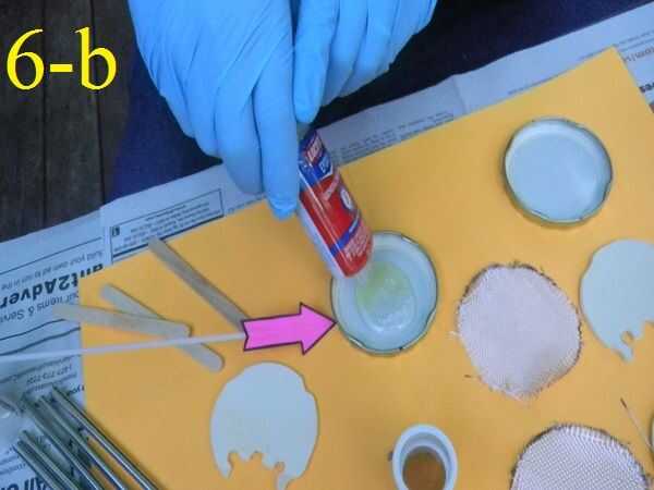 6-b. Después de recoger todos los materiales, mezclar bien las dos partes de epoxy con un palito en la parte inferior de una de las tapas de tarro de la salmuera y extenderlo uniformemente.
